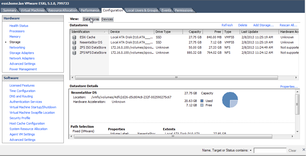 First thing we need to do is get NexentaStor installed in a VM. For obvious reasons, this VM needs to be on local attached storage available to ESXi. In my previous post, you noticed I had some SSD’s in the box. The SSD’s are attached to the motherboard’s SATA controller ports. One SSD contains ESXi itself, & I dedicated another one of the SSD’s for hosting NexentaStor’s VM. These can be set up in the vSphere Client’s configuration screen: