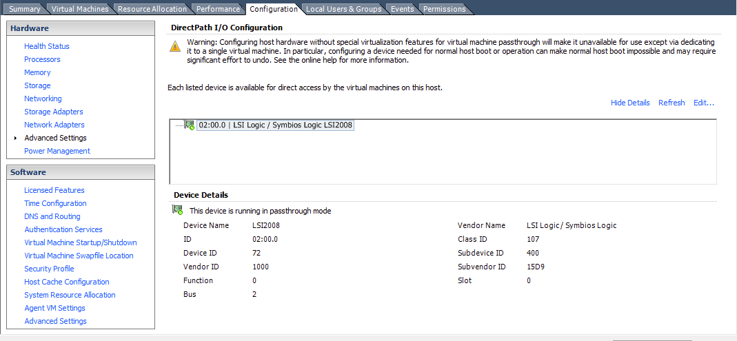 Once NexentaStor is set up, we have to configure it to see the local drives in the server. These drives are attached to the SAS/SATA JBOD controller we bought. It was important to pick the right disk controller because we need to be able to pass it through to the VM directly. This is called VT-d passthrough, a feature ESXi has that allows allocating hardware (usually PCI devices) directly to a VM itself. Usually all hardware passed to a VM is virtualized by ESXi, but in this case, NexentaStor needs direct access to the drives themselves to work it’s ZFS magic. So, in the same ESXi Configuration panel, passthrough can be configured in the “Advanced” section: