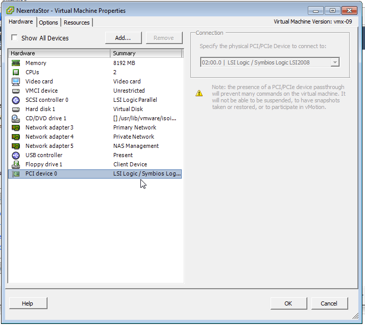 What this does is marks it as available for passthrough to a VM. ESXi will no longer be able to use that device itself. You will have to reboot ESXi after configuring passthrough. Once it has been rebooted, we need to assign the card to the NexentaStor VM. To do that, go to the NexentaStor VM’s configuration window: