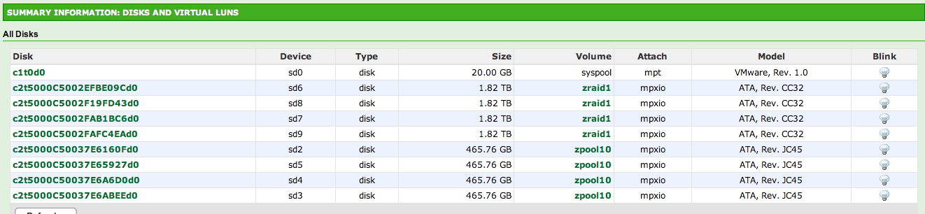 Notice the first one on the list is the VMDK, but the rest show up as physical drives. This is what we want. In my case, I have 4x500GB drives & 4x2TB drives. Yeah it’s a lot for a home lab, but I’m using NexentaStor for more than just SAN storage for ESXi. I’m also using it for data storage via SMB/AFP/NFS/Crashplan, but that’s another post coming soon.
