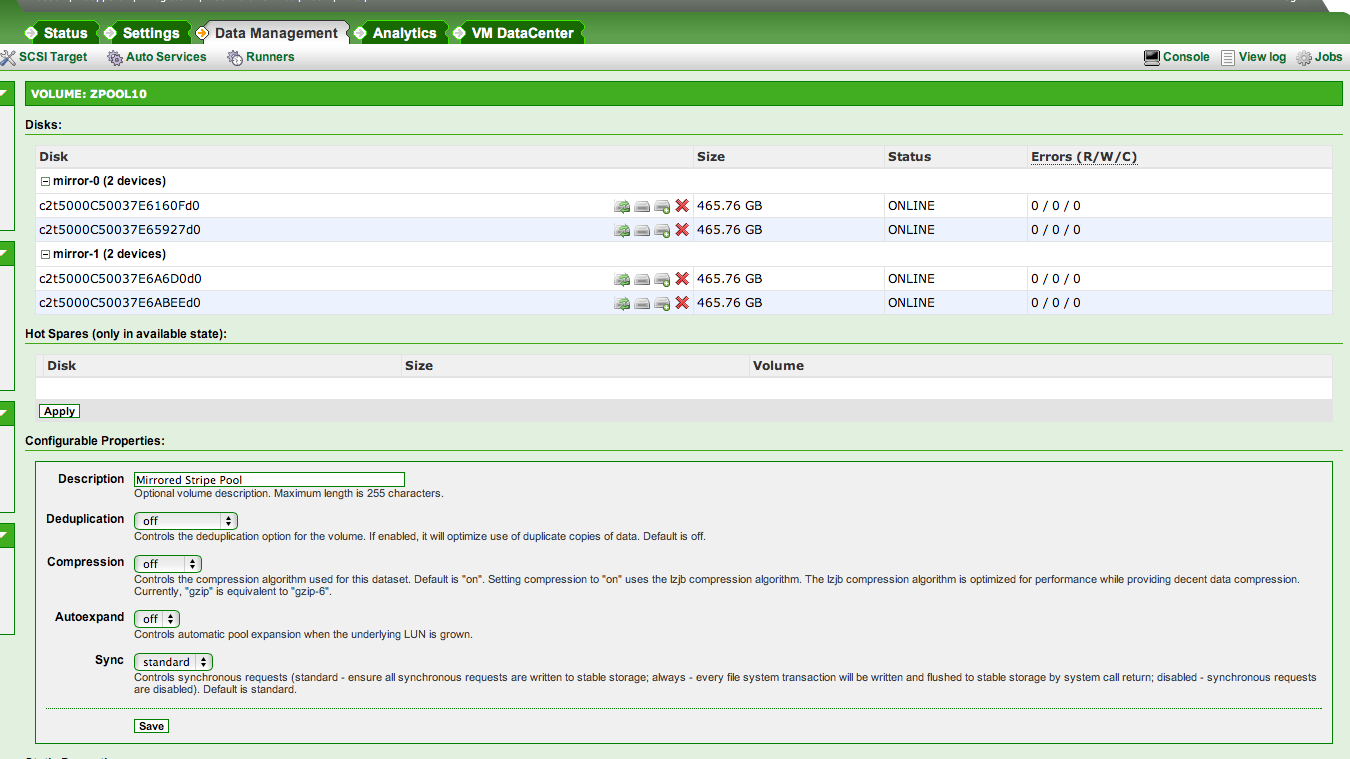 When configuring storage for ESXi, You want as much performance as you can get. A good, cheap way to get performance with ZFS is using striped mirrors, or RAID10. This can be done on the NexentaStor Data Management panel. The end result should look like this: