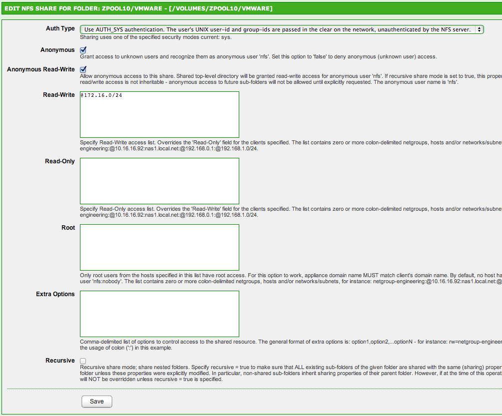 Now that we have the volume created, we need to put a ZFS filesystem on it & share it out to ESXi. NexentaStor calls ZFS filesystems “Folders”. I created a folder called “VMware” & shared it out via NFS: