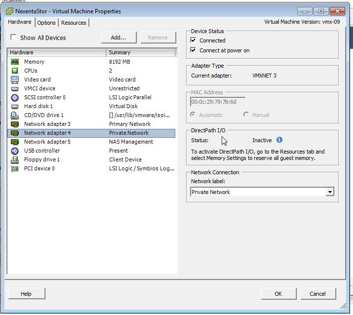 So the last part is we need to create the NIC for NexentaStor that will use this virtual switch, so NexentaStor can provide the storage to ESXi via NFS. Make sure you connect the NIC to the virtual switch, whatever you named it. Mine is named “Private Network”: