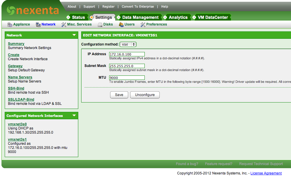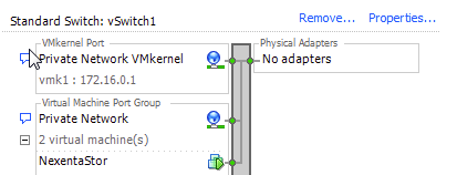 What this will do is allow direct TCP/IP communication between NexentaStor & ESXi itself. The cool thing is the switch is virtual, & is only limited by the hardware you’re running on. I’m not sure what limitations on virtualized switches are & how the correlate to what CPU/RAM is available for ESXi itself, but I haven’t noticed any performance issues at all & the endpoints are full 10Gbe, thanks to vmxnet3. :)